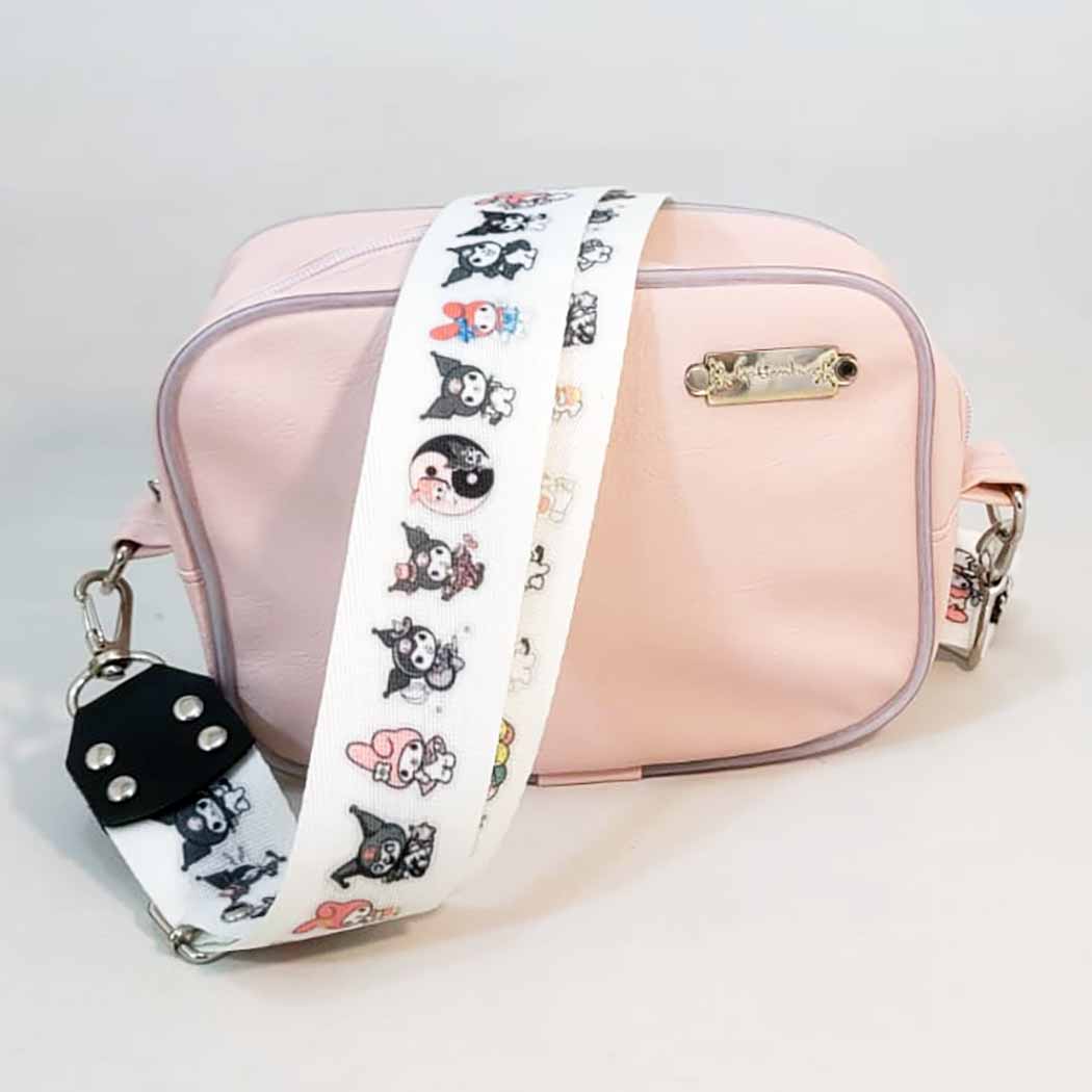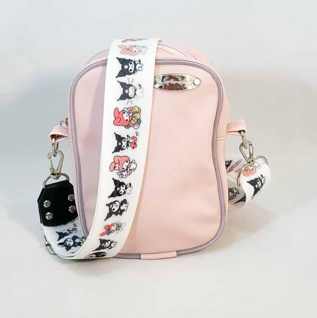 Compacta, práctica y con un diseño que enamora. Realizada en ecocuero rosa pastel con detalle metálico frontal y correa ancha estampada con personajes kawaii, que la hacen súper atractiva y fácil de vender.