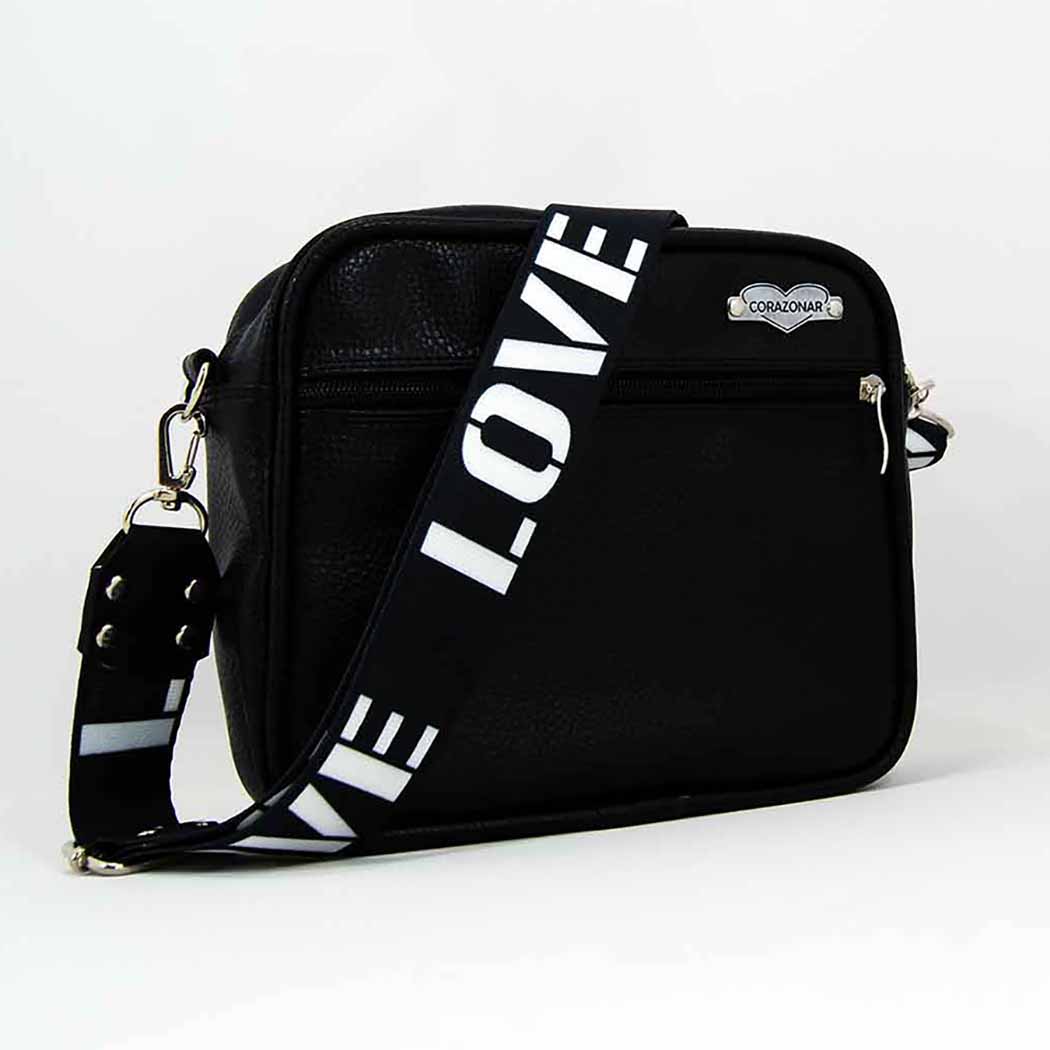Bandolera de símil cuero – 22x18x7 – Marca CORAZONAR – Forrada – NEGRA CINTA LOVE