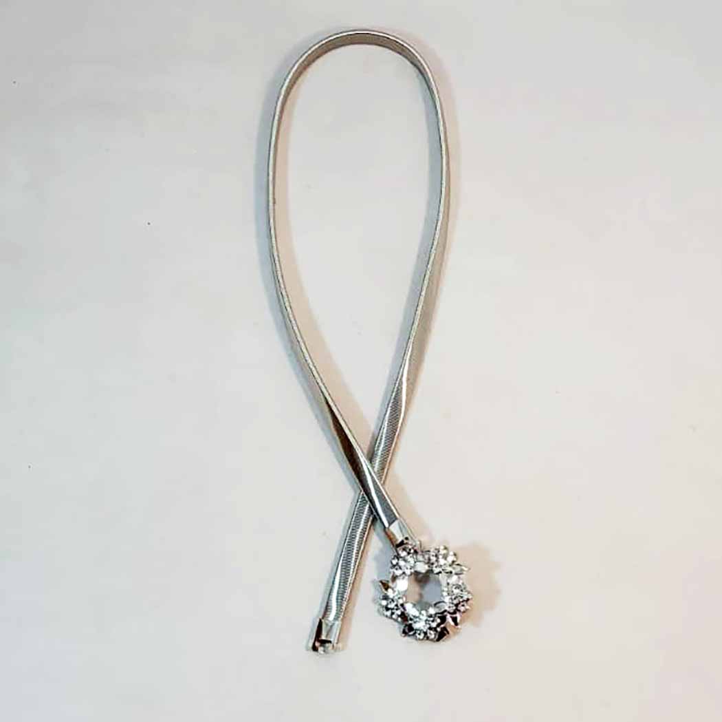 Cinto cadena elástica con detalle metálico decorativo, ideal para realzar vestidos, camisas o sweaters. Se adapta perfectamente al cuerpo y suma un toque de brillo y elegancia.